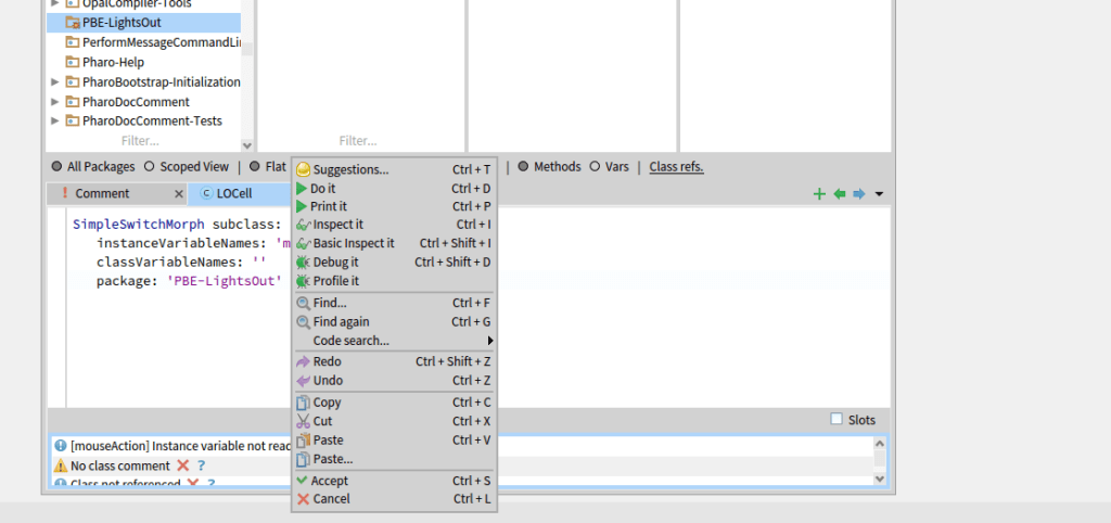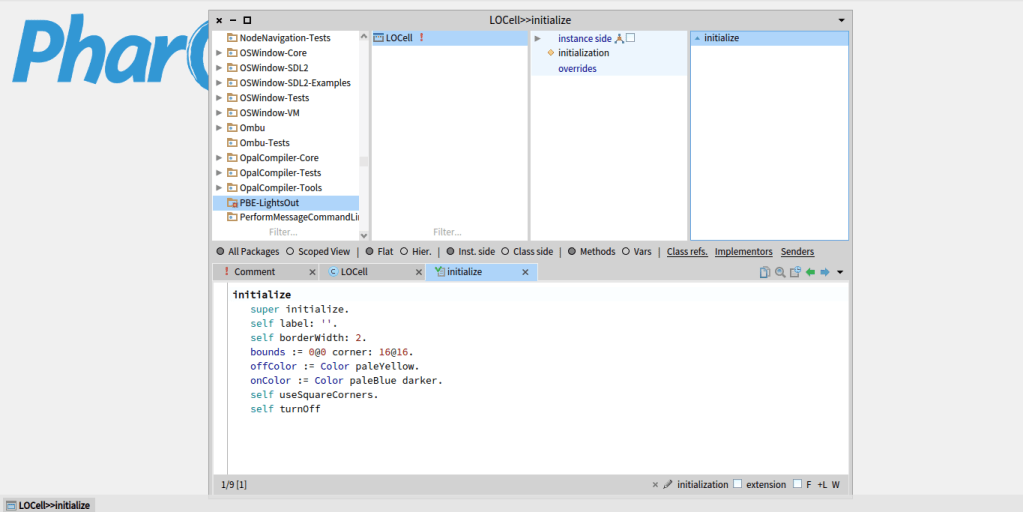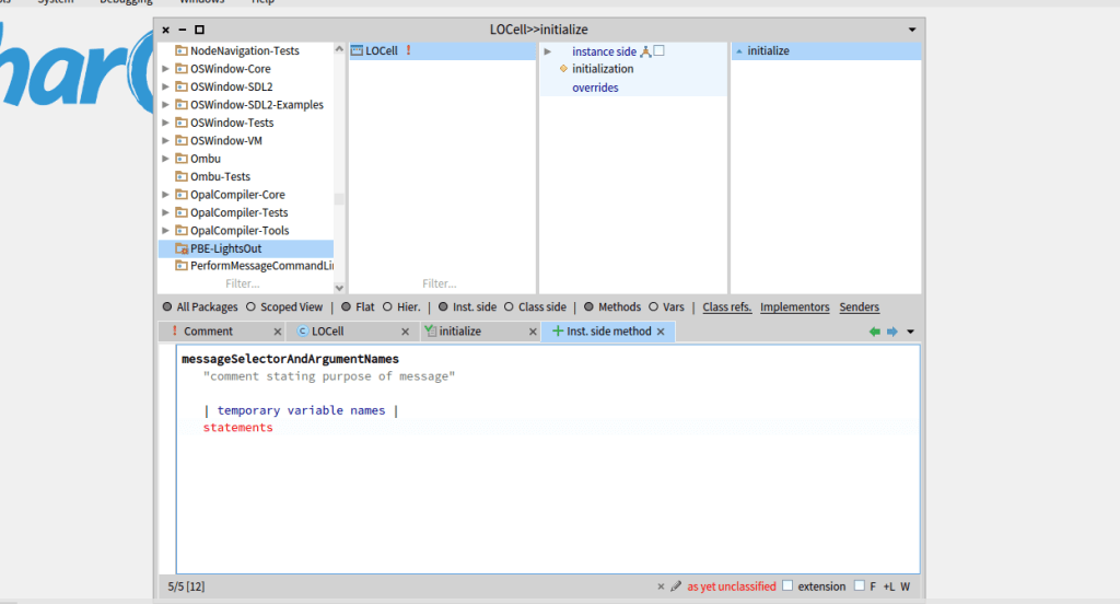 In comparison to the tutorial I’m following the classes or even the methods don’t have to opened to create a new one, it just appear in there, for example if want to create the initialize method, just select the class and a new tab of Inst. side method should appear available